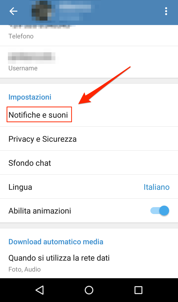 Adesso non vi resta che toccare Notifiche e suoni per accedere alle impostazioni di notifica di Telegram.